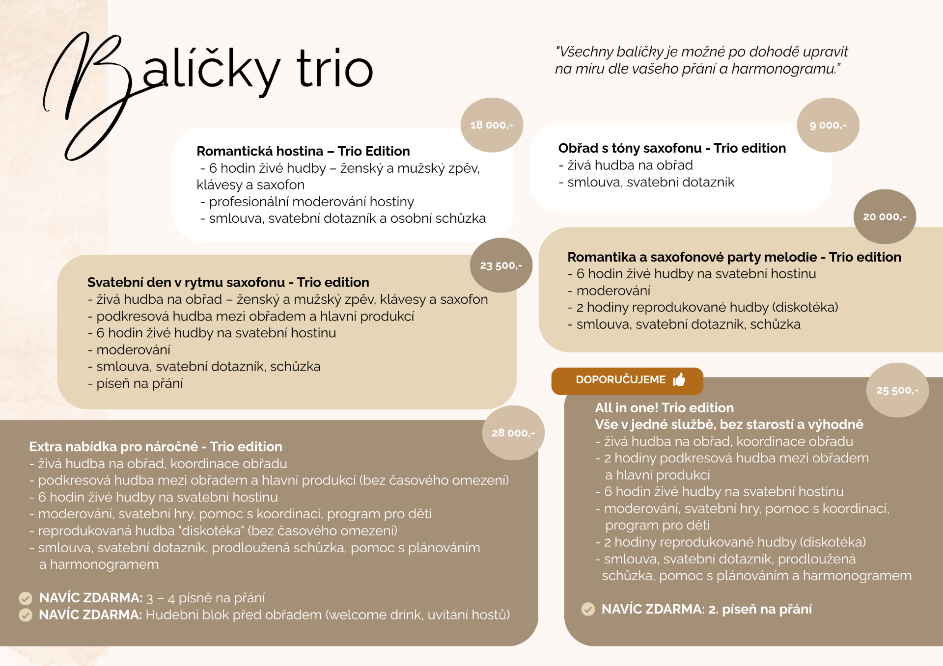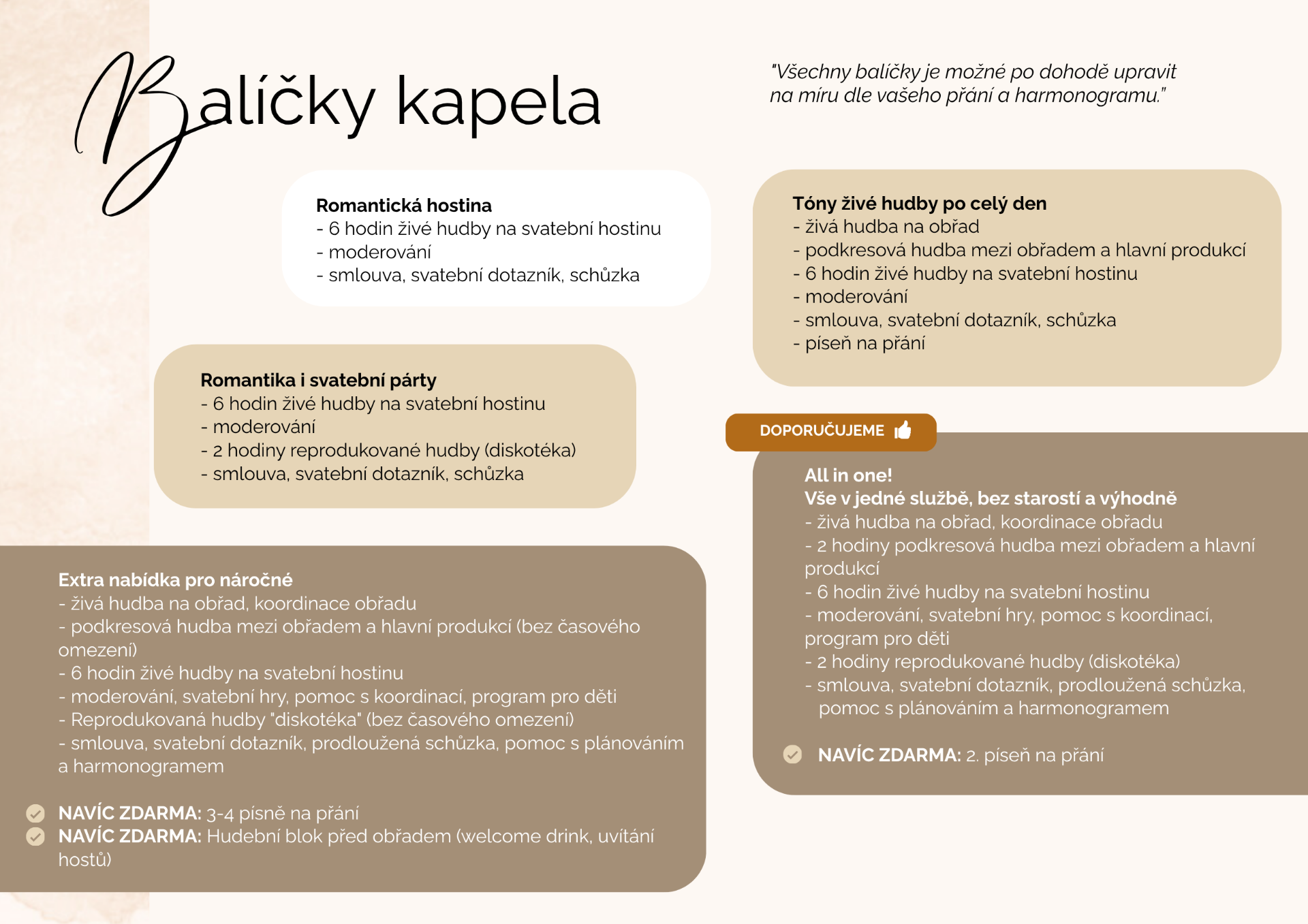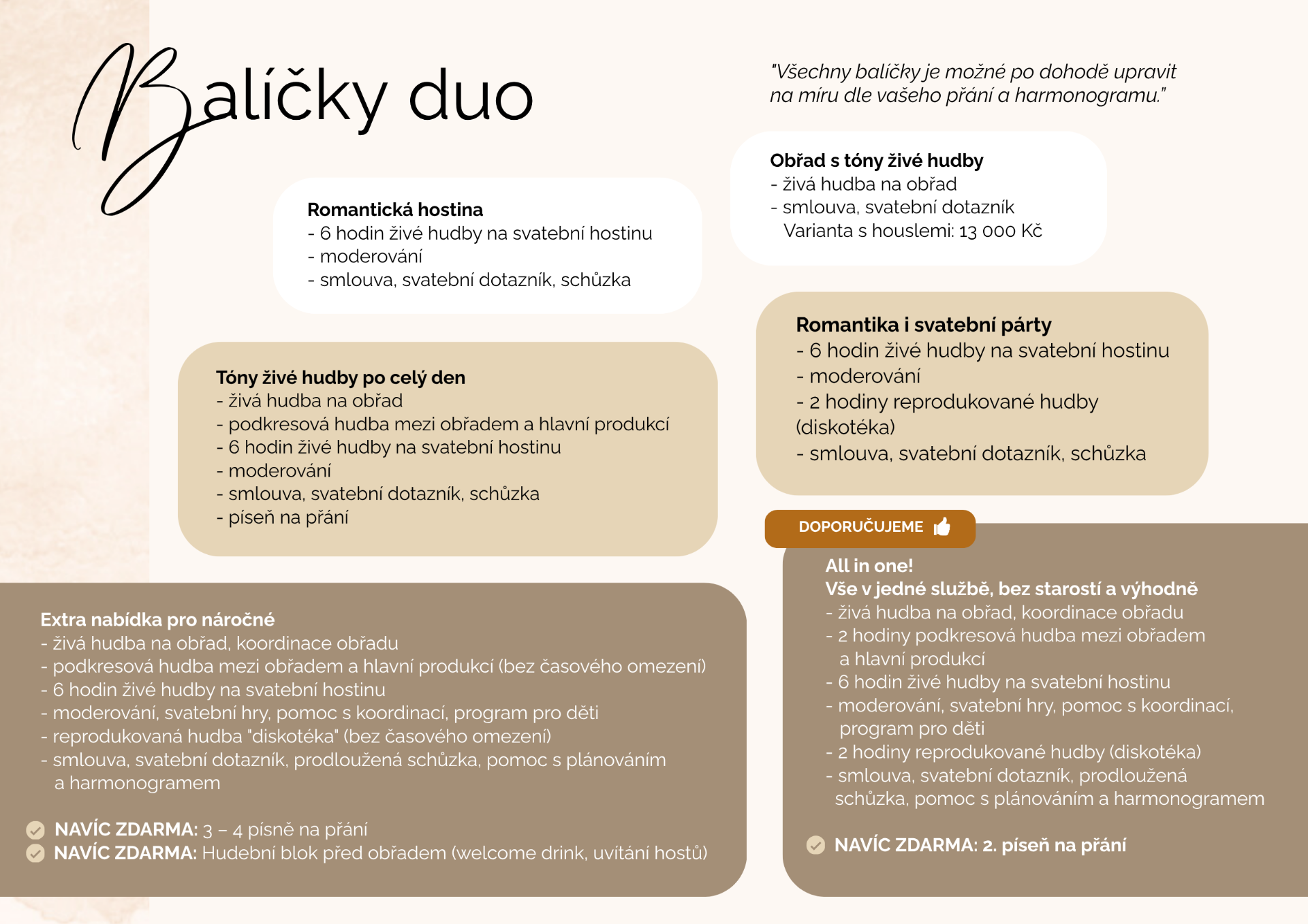 Každá svatba je jedinečná. Proto s vámi ladíme repertoár, délku vystoupení i styl hudby tak, aby přesně odpovídaly vaší představě o dokonalém svatebním dni.